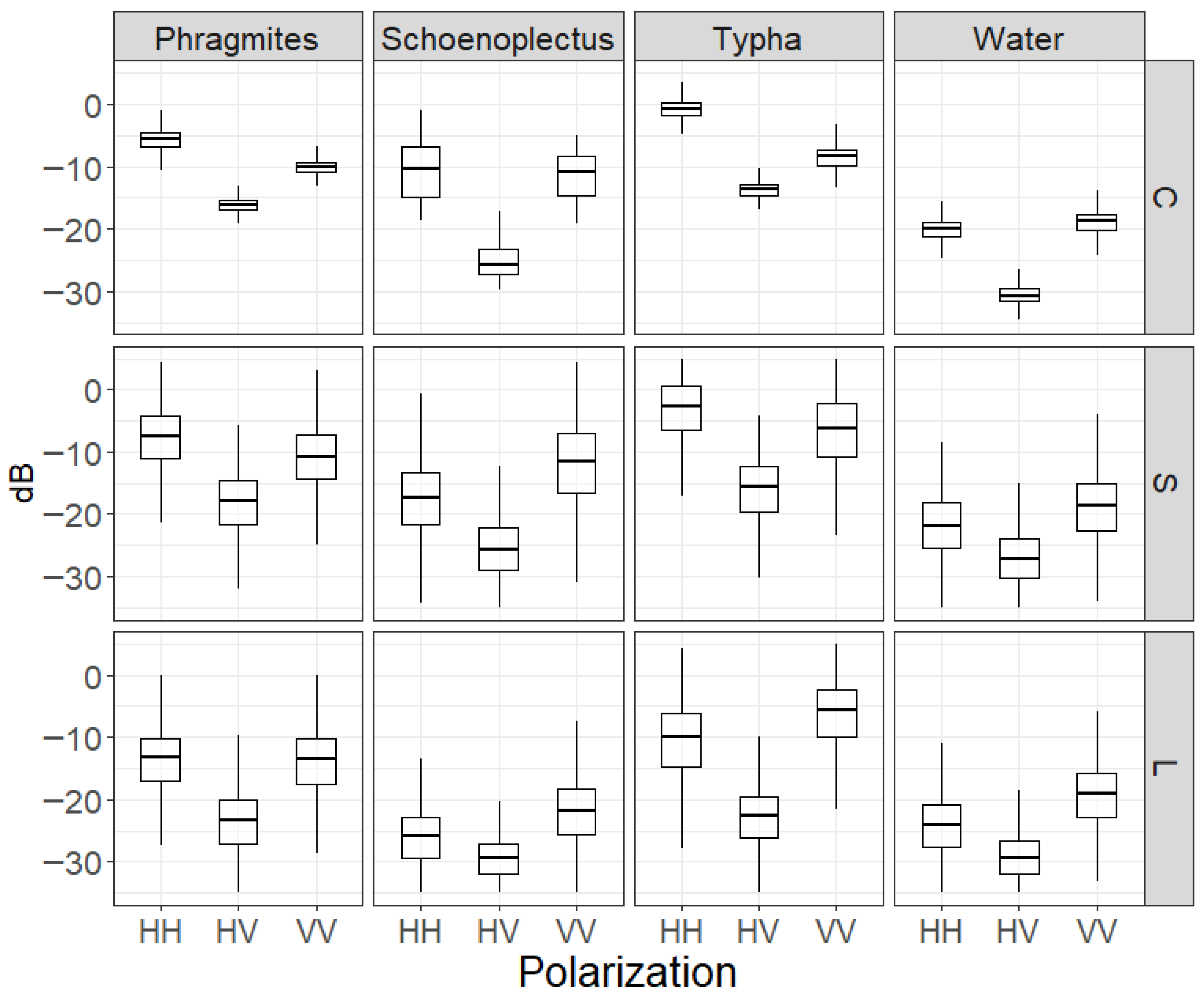5] recommend choosing radar wavelengths that are considerably shorter, or longer, than the diameters of the wetland plant stems of interest to avoid resonance effects in double-bounce backscatter. The anomaly can appear as “holes” in the imagery due to large drops in backscatter, or changes in the dominant scattering mechanism. The plant structure (diameters, heights and density) also restricts which frequency will have penetration limitations or fail to detect vegetation presence. We analyzed three dominant genera found in the southern Great Lakes, which varied in typical size structure. While we cannot give specific thresholds for plant structure limitations with the limited dataset we observed, we provide our results with reference to the typical plant structure for the three dominant genera of our study area as a reference. For