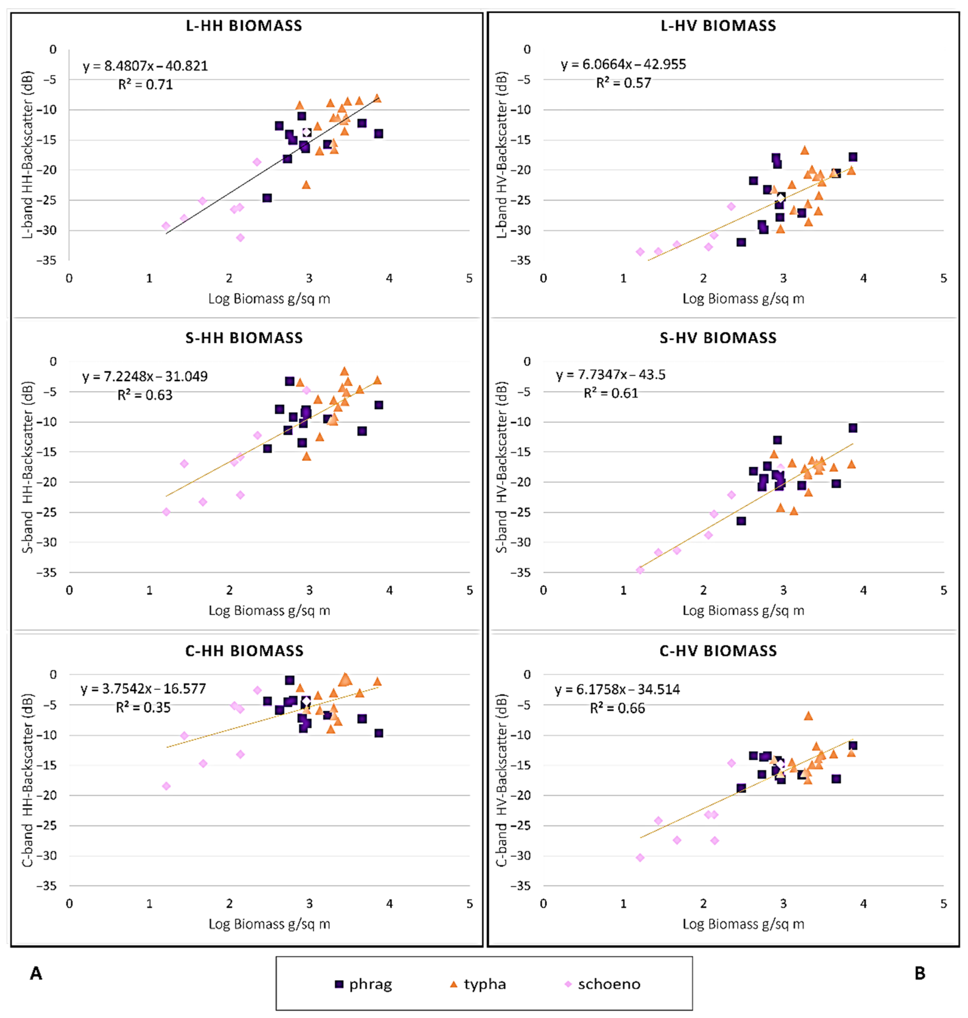 Schoenoplectus which has the sparsest and simplest structure. L- and S-bands were able to detect flooding beneath the high-biomass, dense