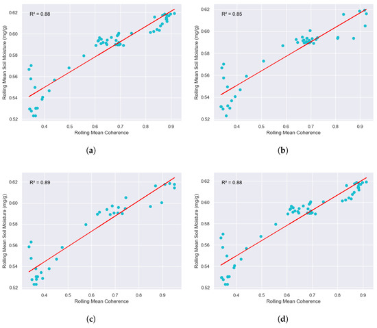 The strongest linear relationships occurred at Munsary subsite C, with these graphed for each of the water reductions with R-squared values. All use the 2-month rolling mean InSAR coherence and soil moisture data. (a) Original data. (b) Removed frozen soil. (c) Removed rain within 6 h (precipitation time). (d) Removed days with over 20 mm precipitation (precipitation amount). (e) Removed frozen soil and rain within 6 h. (f) Removed frozen soil and days with over 20 mm precipitation.