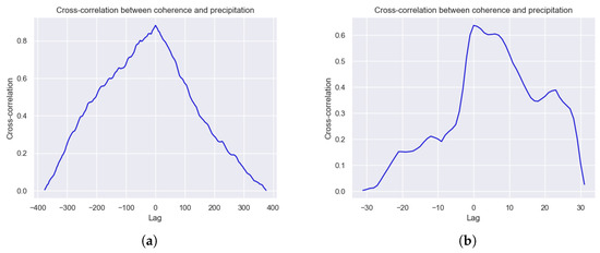 Cross correlation between InSAR coherence data and precipitation, soil moisture and water level for Munsary subsite B with a rolling mean over 6 weeks where data were reduced by frozen soil and precipitation time. (a) InSAR coherence and Wick precipitation data. (b) InSAR coherence and local precipitation data. (c) InSAR coherence and soil moisture. (d) InSAR coherence and water level.