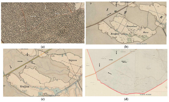 The current state of preservation and the visibility of the rondels are the results of long-term changes in the environment since the sites’ abandonment. The earlier changes are not documented, and there are no archeological finds from later prehistoric or historic periods, but analysis of historical maps from the 18th and 19th century show the interventions that are still visible today. Before the first military survey in the 18th century (because it is visible on that map, going thought the forest), a dirt road was built, which is still in use, that cuts the site in two, leaving two thirds on its northern side and one third on its southern side. That was probably the root of the changes in preservation (Figure 3a). On maps from the 19th century (Figure 3b,c), the area of the southern part of rondel 1 is marked as a field, while other areas are still under woods, and on cadastral maps from the 19th century that area is divide into many small parcels (Figure 3d). These different land biographies, at least in the 18th and 19th century, probably caused the low visibility of the southern part of the rondel Markušica 1 since it was under constant agricultural activity. Parts that were under woods were better preserved.