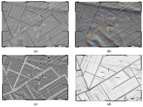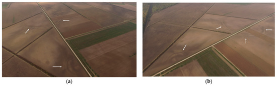 Drone surveys were conducted by the authors using DJI Phantom 3 and DJI Mavic drones. As marked on the figures, the ditches of the small rondel and the big enclosure are clearly visible (Figure 7, Figure 8 and Figure 9). With drones, June is good for crop mark tracing of the enclosures on the Markušica site (Figure 8a,b) while late autumn is good for recording soil marks (Figure 7 and Figure 9).
