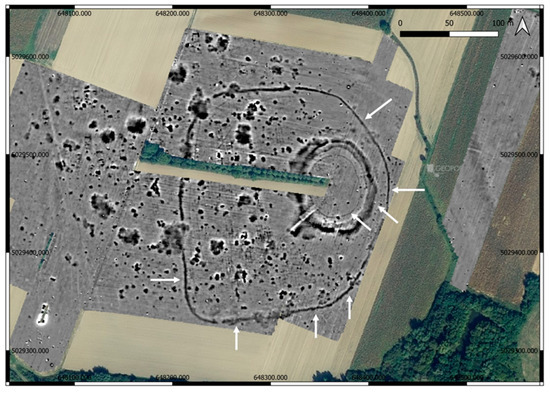 The rondel was observed on the earliest satellite images on Google Earth, dated 23 August 2007, where parts of three ditches are visible. On later Google Earth images, the ditches are less clearly visible, but the circular area can still be distinctly recognized as darker compared to the surrounding ground. In a similar way (Figure 16), it can be seen on aerial photographs available on the Geoportal (2011, 2014–2016, 2017), as well as in drone and airplane surveys ([15] Figure 6, Figure 7, Figure 8, Figure 9 and Figure 10), [12].