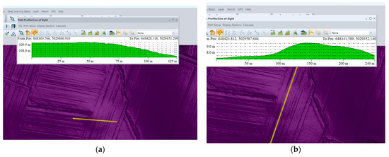 Path profiles of Markušica 1 rondels in Global Mapper, visualized using REM shader. (a) North–south profile; (b) west–east profile. Subtle changes in the topography are visible on the path profile and the position of the ditches. The highest elevation is in the middle part of the rondel.