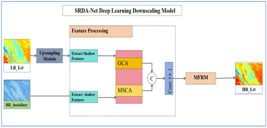 To achieve the downscaling of land surface temperature (LST), this study proposes the spatial resolution downscaling attention network (SRDA-Net), hereafter referred to as “SRDA-Net.” As illustrated in Figure 3, the network utilizes low-resolution () data alongside a range of high-resolution auxiliary data () as inputs.