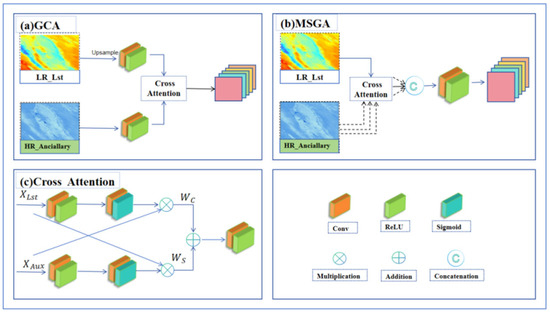 The attention mechanism enhances the critical information while suppressing less important data by dynamically assigning weights. Leveraging this mechanism, deep learning networks can efficiently focus on significant features, thereby improving the efficiency and accuracy of feature extraction. In this study, as shown in Figure 4c, a cross-attention mechanism was employed to capitalize on the complementary strengths of low-resolution (LR) LST data and high-resolution (HR) auxiliary data. This was achieved through two distinct data combination patterns corresponding to the global resolution cross-attention (GCA) module and the multi-source resolution attention (MSCA) module, facilitating the mutual calibration of multi-source and multi-scale features.