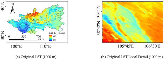 In this experiment, the geographically weighted average (GWA) method was first used to upscale the original MODIS LST data from a resolution of 1000 m to 2000 m, thereby creating a low-resolution input field. Subsequently, the resampled auxiliary factor dataset, with a resolution of 1000 m, was incorporated into the process. The SRDA-Net model was then trained to reconstruct the original 1000 m LST data, aiming to systematically evaluate its ability to recover spatial information.