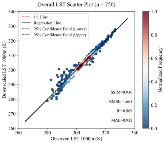 The station-based validation, the model-generated 250 resolution LST product was compared with available in situ measurements from meteorological stations within the study area. The validation method involved directly matching and comparing the predicted LST value of a single 250 pixel containing a specific meteorological station with the in situ measurement from that station. The validation results demonstrate that the RMSE was 1.804 K, MAE was 1.587 K, R2 reached 0.915, and the bias was 0.24 K (Figure 10). These results validate the effectiveness of the downscaling model in enhancing spatial resolution while preserving numerical accuracy.