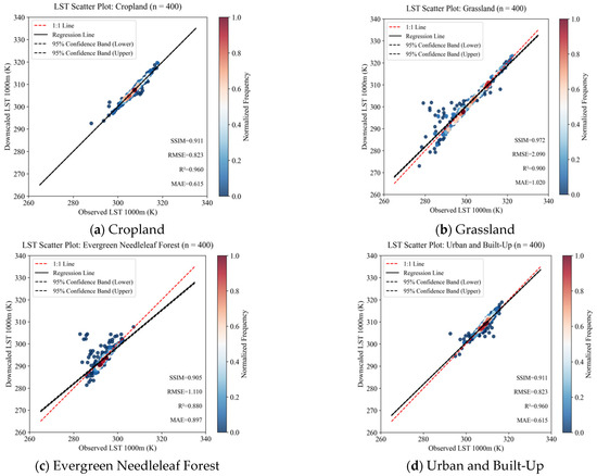The comprehensive evaluation presented in Figure 7 shows that the SSIM is 0.948, the MAE is 0.928 K, the R2 is 0.951, and the RMSE is 1.664 K. These indicators underscore the SRDA-Net model’s exceptional performance in spatial feature restoration and numerical accuracy, effectively reconstructing spatial details while preserving high numerical precision. To further assess the model’s adaptability to various land surface types, pure pixel samples were extracted from land cover partitions on representative days in the typical mixed sample area. Scatter plots of predicted vs. observed values were then generated (Figure 8).