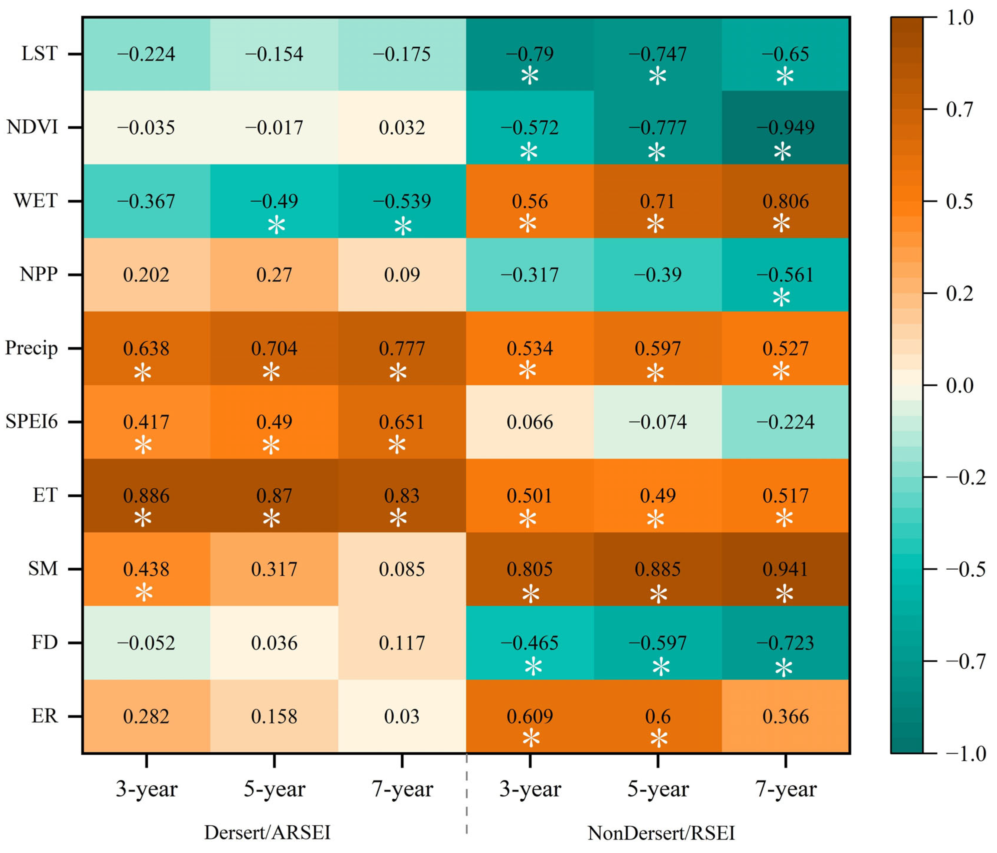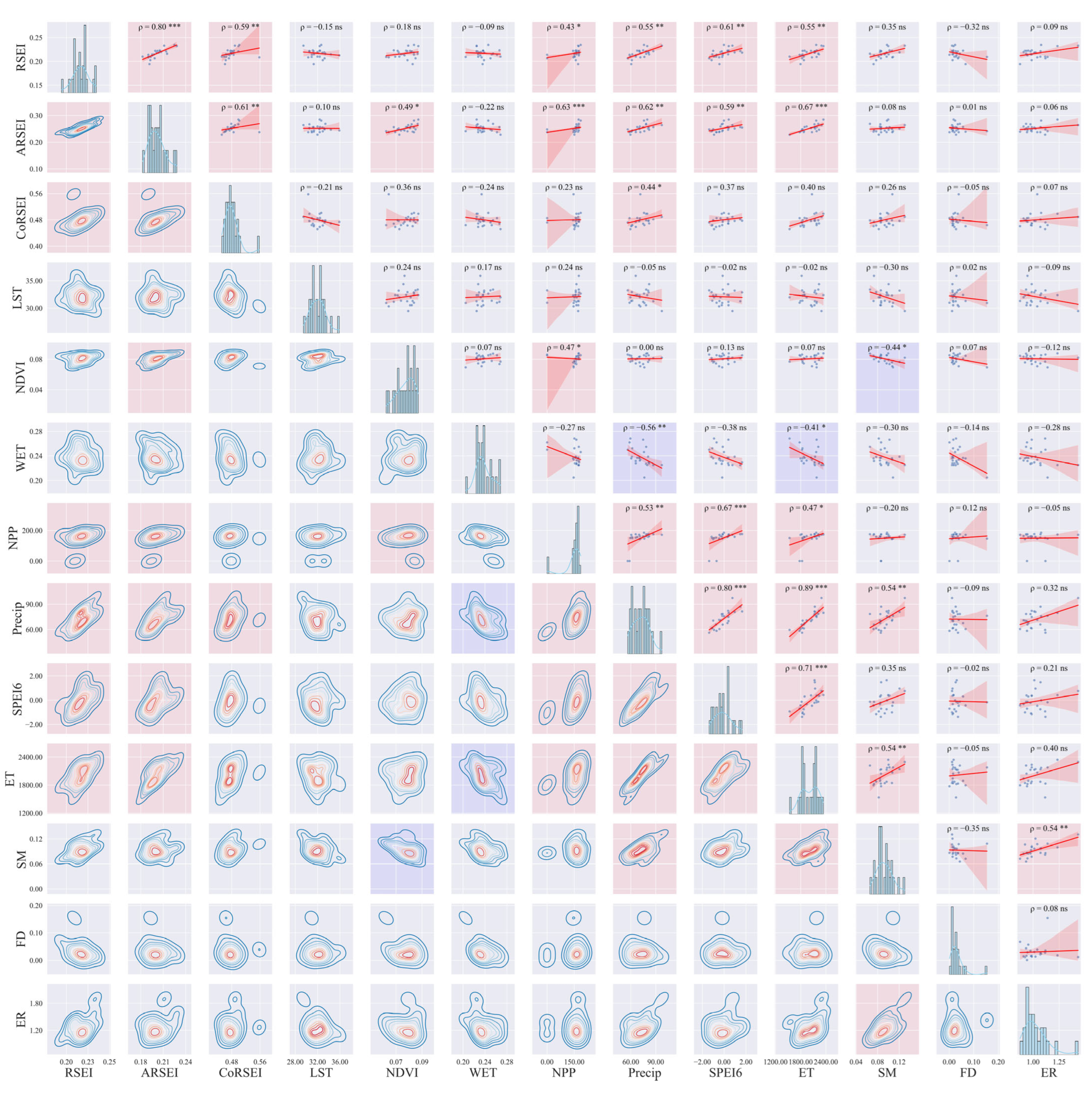3.1.2. Correlation Structure and Joint Distribution Patterns of RSEIs and Environmental Drivers