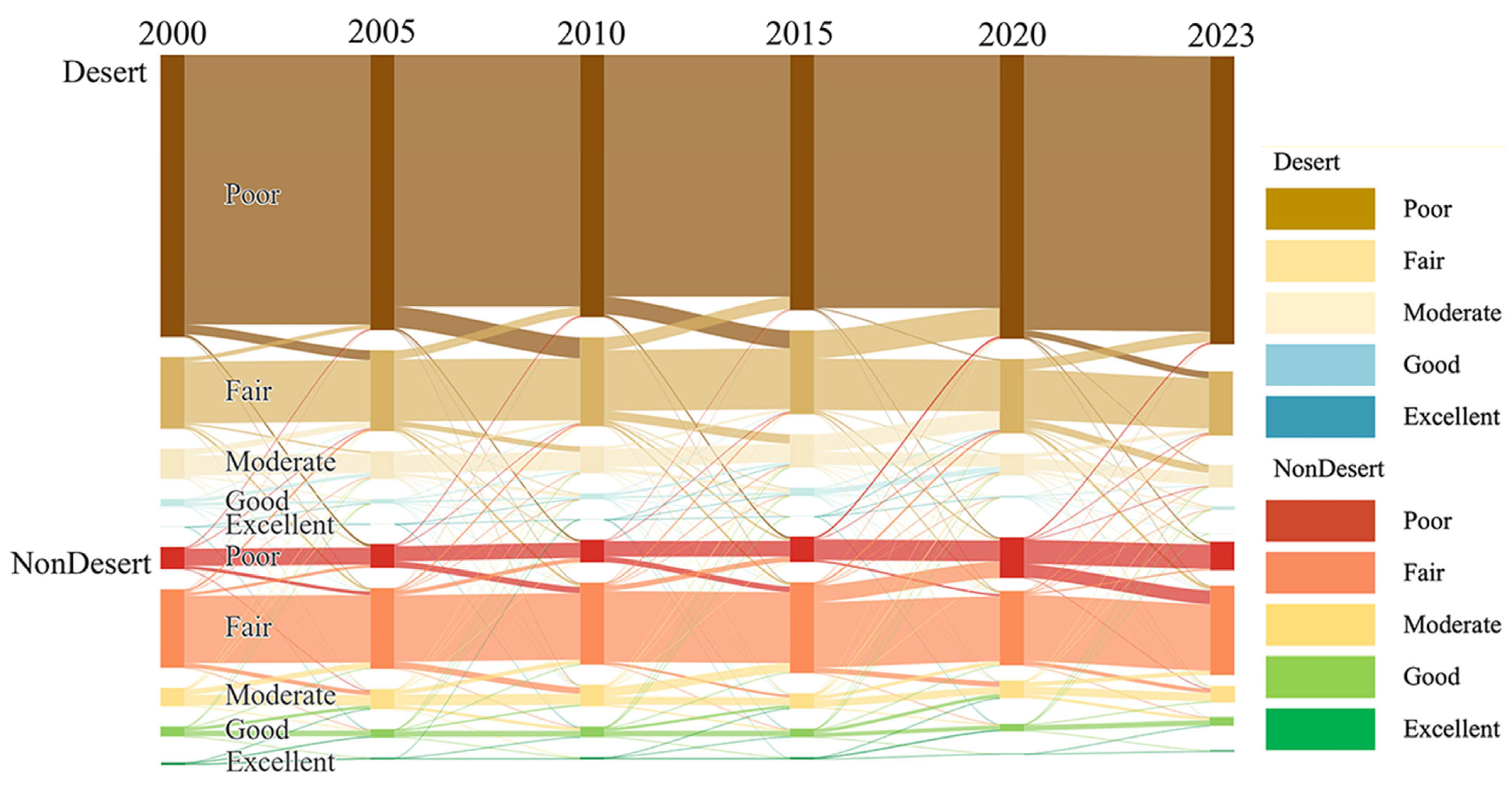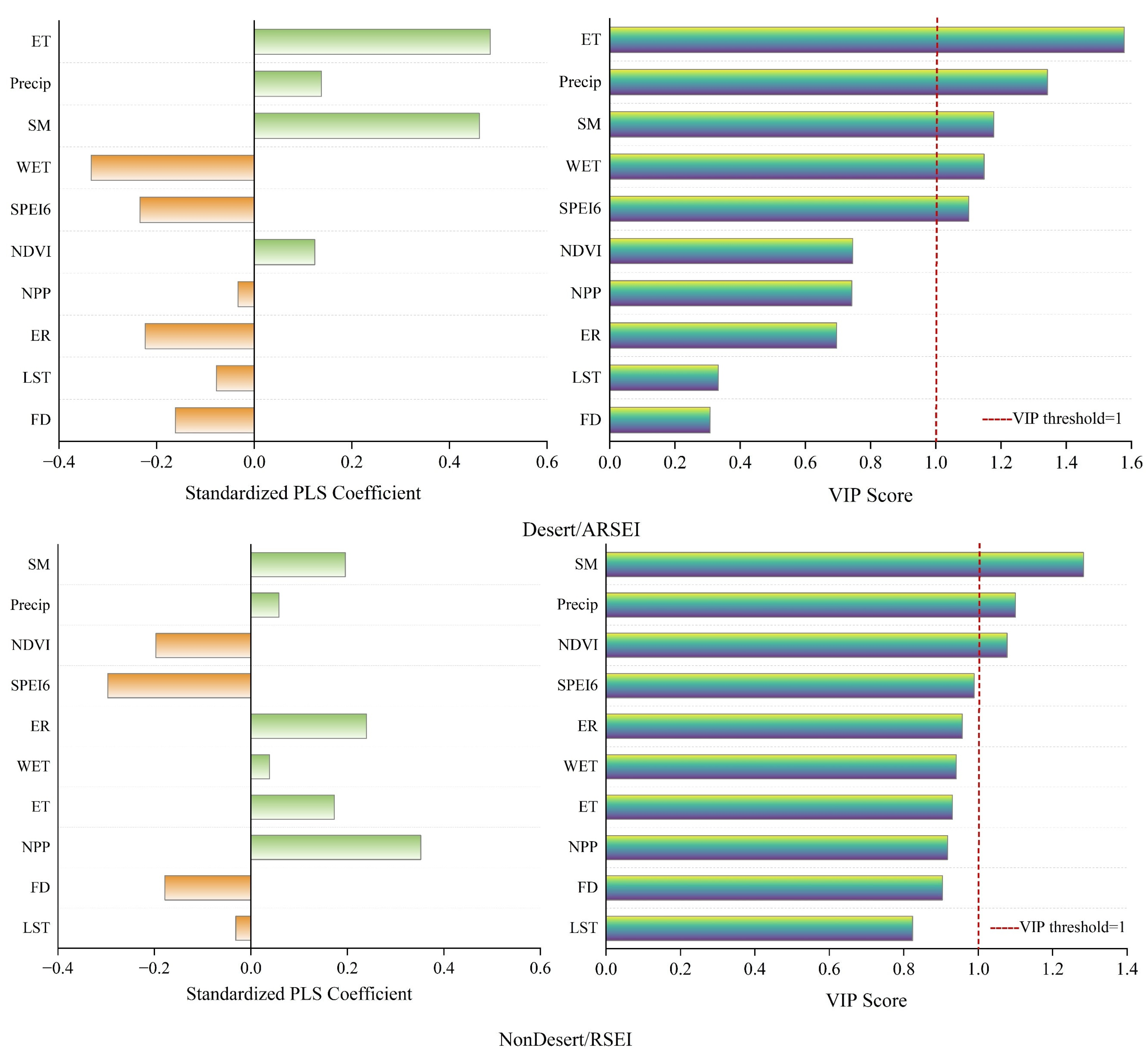 - Regional Differences in Environmental Drivers: In desert areas, evapotranspiration, precipitation, and soil moisture were identified as the primary positive drivers of ecological conditions. In contrast, in non-desert areas, although soil moisture and precipitation remained important, ecological dynamics were also influenced by vegetation indices (NDVI, NPP) and disturbance-related variables such as fire density and land surface temperature. Some of these factors exhibited negative correlations, indicating more complex ecological response mechanisms.