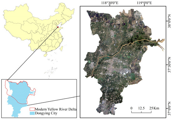 The geographic location of the modern Yellow River Delta is defined by Kenli and Ninghai as its apex, extending from the Taoer River mouth in the north to the tributary ditch mouth in the south, covering a total area of approximately 5400 square kilometers. Among them, about 93% of the Yellow River Delta is located in Dongying City, Shandong Province. Dongying City is not only a city at the mouth of the Yellow River but also the central city of the Yellow River Delta, possessing unique geographical significance. Therefore, this research focuses on Dongying City as the study area in analyzing the evolution of rural settlements in the YRD. Dongying is located in the northern part of Shandong Province, within the YRD region. It administers three districts and two counties: Dongying District, Hekou District, Kenli District, Lijin County, and Guangrao County. Geographically, it lies between 36°55′N and 38°10′N latitude, and 118°07′E and 119°10′E longitude. It is bordered by the Bohai Sea to the east and north, Binzhou City to the west, and Zibo and Weifang cities to the south, covering a total area of 8243 km2 (Figure 1). The region features a typical warm temperate continental monsoon climate and is predominantly flat, consisting mainly of plains. Wetlands and saline-alkali land are widely distributed throughout the area, with a low and slightly inclined terrain. As of the end of 2023, the permanent population of Dongying City was approximately 2.206 million, of which 606,900 were rural residents.