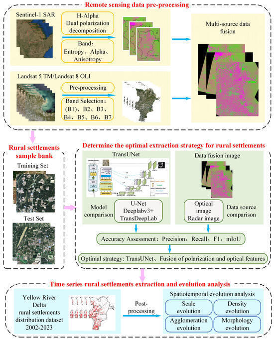 The Yellow River Delta (YRD) is a vital agricultural and ecologically fragile zone in China. Understanding the spatial pattern and evolutionary characteristics of Rural Settlements Area (RSA) in this region is crucial for both ecological protection and sustainable development. This study focuses on Dongying, a key YRD city, and compares four advanced deep learning models—U-Net, DeepLabv3+, TransUNet, and TransDeepLab—using fused Sentinel-1 radar and Landsat optical imagery to identify the optimal method for RSA mapping. Results show that TransUNet, integrating polarization and optical features, achieves the highest accuracy, with Precision, Recall, F1 score, and mIoU of 89.27%, 80.70%, 84.77%, and 85.39%, respectively. Accordingly, TransUNet was applied for the spatiotemporal extraction of RSA in 2002, 2008, 2015, 2019, and 2023. The results indicate that medium-sized settlements dominate, showing a “dense in the west/south, sparse in the east/north” pattern with clustered distribution. Settlement patches are generally regular but grow more complex over time while maintaining strong connectivity. In summary, the proposed method offers technical support for RSA identification in the YRD, and the extracted multi-temporal settlement data can serve as a valuable reference for optimizing settlement layout in the region.