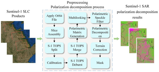 The Sentinel-1 data preprocessing was mainly performed in SNAP Desktop v9.0.0 software. The workflow included orbit refinement using precise orbit files, thermal-noise removal based on metadata-provided lookup tables, radiometric calibration to convert pixel values to backscattering coefficient σ0 (σ0 = |DNi|2/Ai2, where DNi and Ai are pixel gray value and calibration parameter, respectively), speckle filtering using the Refined Lee filter to reduce noise while preserving radiometric and texture information, and terrain/geocoding correction using a 30 m SRTM DEM to correct geometric distortions, with resampling to 10 m spatial resolution. The detailed processing workflow and result of the Sentinel-1 SAR H-Alpha decomposition are illustrated in Figure 3. The specific Cloude-Pottier H/α/A decomposition implemented in this study for dual-polarized Sentinel-1 data requires SLC products that contain phase information to generate the covariance matrix [C2]. For fully polarimetric data, the same decomposition would operate on a 3 × 3 coherence matrix [T3] [44,45].