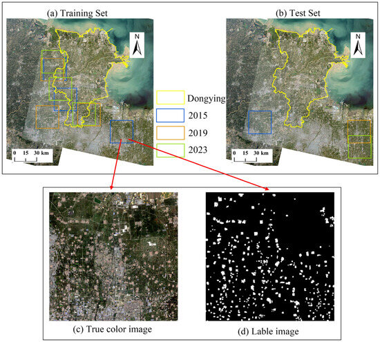 The “Third Law of Geography” asserts that “the more similar the geographical environments, the more similar the geographic features” [47]. This fundamental principle suggests that locations with comparable environmental conditions tend to exhibit analogous spatial characteristics and patterns. Given the high similarity in both geographical environment and remote sensing characteristics between the study area (Dongying City) and the surrounding Yellow River Delta region, we prepared the sample set using fused optical and Sentinel-1 radar data from only the 2015, 2019, and 2023 images to enhance sample diversity and reduce the workload of manual interpretation by selecting typical areas with concentrated RSA from the downloaded Landsat scene for sample set preparation. In the study, RSA is defined as contiguous built-up areas dominated by rural residences, including residential clusters, courtyards, and associated infrastructure (e.g., village roads, small squares), which covers all identifiable RSAs, including natural villages and urban villages. Consequently, the sample set extended beyond administrative boundaries and covered parts of Dongying City, Zibo City, Binzhou City, and Weifang City.