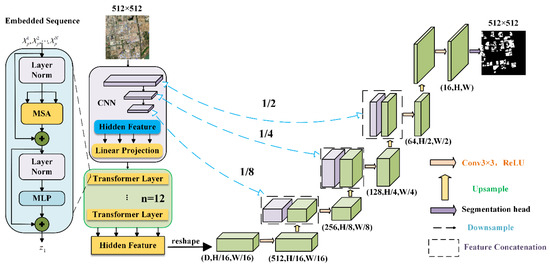 The encoder part adopts a CNN-Transformer architecture, where CNN is first used as a feature extractor to generate a feature map for the input image. The extracted image features from the CNN feature map undergo a 1 × 1 patch embedding, replacing the patch embedding method from the original image. The Transformer encoder consists of multiple identical Transformer layers, each containing two sub-layers: self-attention and a feed-forward neural network. The self-attention mechanism captures the relationships between different regions in the image, enabling the model to better understand the global context of the image. The decoder part retains the classic U-Net structure, composed of multiple upsampling and convolution operations. Each upsampling operation enlarges the feature map while preserving the feature information, gradually recovering the image’s spatial resolution. Similarly to traditional U-Net, the decoder uses skip connections to combine low-level and high-level features from the encoder, preserving and transmitting detailed information to the final segmentation result.