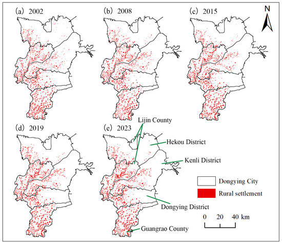 In recent years, with the rapid economic growth and accelerated urbanization, a series of issues have emerged in rural settlements area (RSA). On the one hand, the swift socio-economic development has attracted a large number of rural laborers to migrate to urban areas, resulting in many RSA becoming “hollow villages”, thereby reducing the efficiency of regional land use [1,2]. On the other hand, the increase in agricultural income has triggered a surge in new construction, expansion, and renovation of rural housing, leading to disordered and low-density expansion of RSA. This has accelerated the loss of arable land, posed potential threats to food security, and adversely affected the regional ecological environment, thus hindering the development of agricultural productivity and the smooth progress of urbanization [3,4,5]. As a typical alluvial plain in the Yellow River Basin, the Yellow River Delta (YRD) is characterized by unique sediment deposition and river course changes, creating a dynamically evolving ecological environment. This makes it a representative area for studying the evolution of RSA under special geological conditions. Timely acquisition of the spatial pattern and spatiotemporal evolution characteristics of RSA in the region is of great significance for ecological protection and sustainable development planning [6,7].