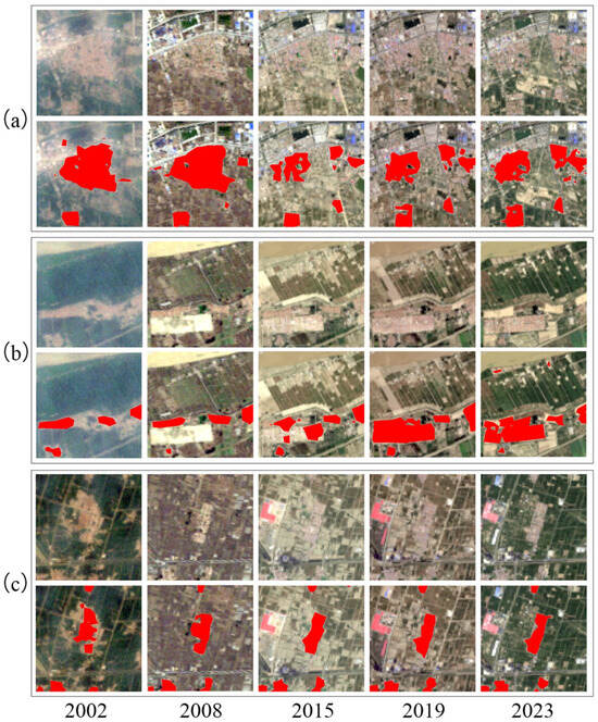 In terms of methodology, sample patches were selected from entire satellite scenes covering Dongying and surrounding areas to maximize data diversity and ensure robust model training. Owing to the high similarity in geographical and settlement characteristics across these areas, this strategy provided a reliable basis for model development, and the independent test patches remain representative for Dongying. A key limitation, however, is the lack of SAR data prior to 2014, which restricted multi-source training to 2015, 2019, and 2023. For 2002 and 2008, the trained model was directly applied to optical imagery only. Visual inspection confirmed that the predicted settlement patterns aligned well with the original Landsat imagery, suggesting good model generalization, though differences in predictor availability may introduce some uncertainty in long-term comparisons. Future research should consider incorporating alternative SAR archives or harmonized optical-only approaches to further improve temporal consistency and robustness, and seek higher-resolution optical imagery to improve the accuracy of RSA detail extraction.