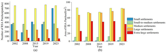 To investigate changes in the scale and hierarchy of RSA in Dongying City, this study employed GIS spatial analysis to calculate the area of each RSA patch. The classification of RSA into five scales—Small settlements (≤0.01 km2), Small-to-medium settlements (0.01–0.05 km2), Medium settlements (0.05–0.2 km2), Large settlements (0.2–0.5 km2), and Extra-large settlements (≥0.5 km2). This classification scheme was determined by referring to common practices in rural settlement studies, where four to five size categories are typically adopted to reflect structural heterogeneity. Considering the actual distribution of settlement sizes in Dongying City, the thresholds were further adjusted to capture local characteristics shaped by both natural and socio-economic conditions. The number of patches and the total area of patches for each category were statistically analyzed. Detailed results are presented in Figure 8, Table 4 and Table 5.