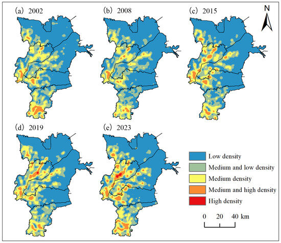 The kernel density analysis method, based on a non-parametric model, transforms discrete sample data into a continuous distribution function while eliminating the influence of unknown factors [57]. This allows for a more intuitive and clear analysis of the dynamic evolution of variables. In this study, the polygon features of RSA across five time periods in Dongying City were converted into point features, and kernel density analysis was conducted based on the point data. The kernel density results were classified using the natural breaks method, divided into five density intervals, including [0, 0.18), [0.18, 0.51), [0.51, 1.00), [1.00, 2.38), and [2.38, 3.55] (Unit: settlements/km2). These intervals represent low-, low–medium-, medium-, medium–high-, and high-density RSA zones, respectively. The detailed analysis results are illustrated in Figure 9.