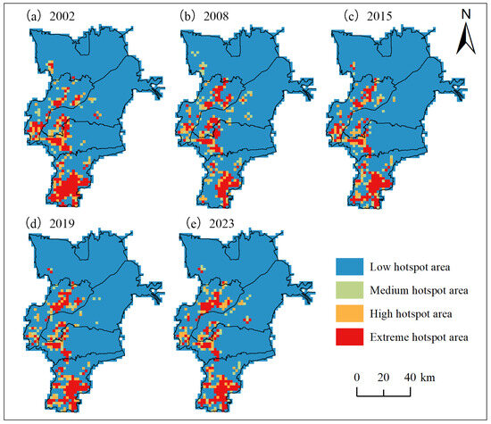 Hotspot analysis identifies areas of local high-value aggregation (hotspots) and low-value aggregation (cold spots), providing a detailed depiction of the spatial distribution of specific phenomena [58]. In this study, a 2 km × 2 km grid was selected as the analysis unit after comparative trials with multiple scales, as it provided the most effective balance between spatial detail and interpretability, and proved most suitable for revealing meaningful clustering patterns of RSA. Vector data of RSA across five time periods in Dongying City were spatially associated with the grid based on settlement area attributes. The Hot Spot Analysis tool was applied to detect spatial clusters based on settlement area within each grid cell. The results were then classified into four intensity levels using the natural breaks method: Low, Medium, High, Very High. These levels represent the varying intensities of settlement scale clustering, with the results illustrated in Figure 10.