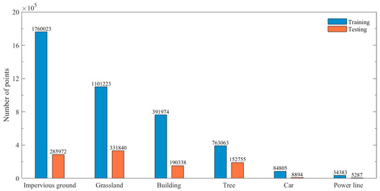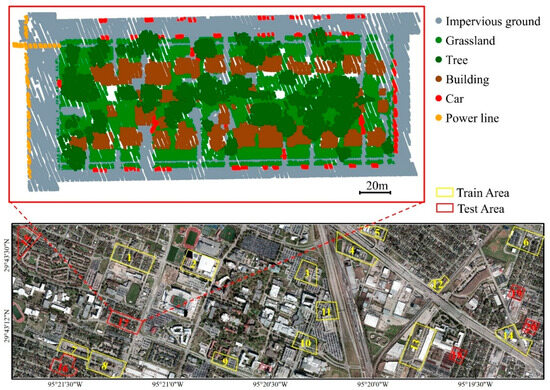 The dataset covers the University of Houston main campus and its adjacent urban regions in the United States. The entire point cloud is divided into 14 tiles, from which 20 subregions were selected for manual annotation. To ensure a representative sampling of scene variability, we selected regions that are spatially distributed across the study area and that collectively contain all six classes: impervious ground, grassland, tree, building, car, and power line. The annotated points within these regions (areas) were then labeled according to the six defined classes. Areas 1–14 were designated for training, and Areas 15–20 were reserved for testing. The spatial distribution of these annotated regions is shown in Figure 1.