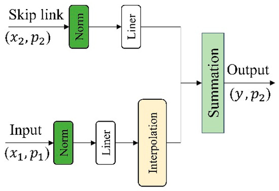 After determining the neighborhood for each downsampled point , the corresponding coordinates and features are aggregated together. The coordinates and features are concatenated, then transformed through a linear layer and normalization operation. Finally, a max pooling layer is applied to produce the aggregated features Fi and the corresponding new coordinates .