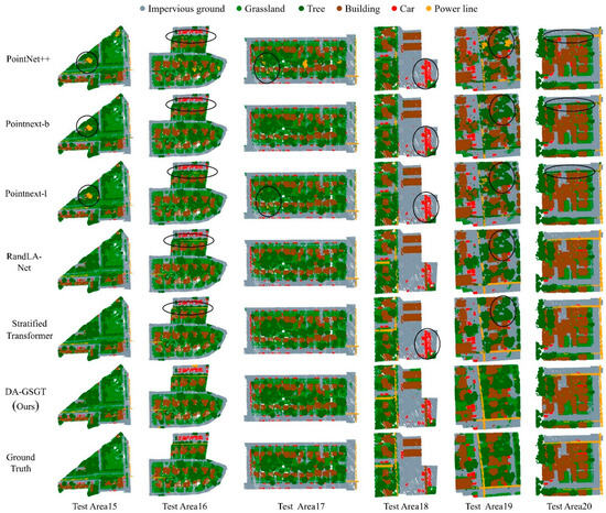 Extensive quantitative comparisons against five baseline methods—PointNet++, PointNeXt-b, PointNeXt-l, RandLA-Net, and Stratified Transformer—demonstrate that DA-GSGTNet attains superior segmentation accuracy, achieving an mIoU of 86.43%, mAcc of 93.74%, and OA of 90.78%. Ablation studies confirm the individual and complementary benefits of each module: DATD is crucial for preserving global structure during downsampling, while GSGT-Blocks and distance-biased position encoding significantly enhance the discrimination of fine and sparse objects.