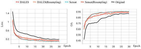 As shown in Table 5, pretraining on DALES and Sensat recovers most of the full-training mIoU while reducing the epochs required for convergence. Figure 10 illustrates that pretraining also accelerates convergence. While the non-pretrained model requires approximately 15–20 epochs to reduce the validation loss below 0.3 and raise OA above 90%, models pretrained on DALES or Sensat achieve this within 5–10 epochs and maintain stable convergence thereafter. Resampling has little effect on convergence speed, indicating that this preprocessing step has limited impact on training dynamics.