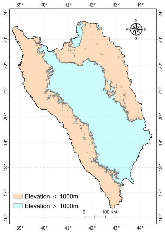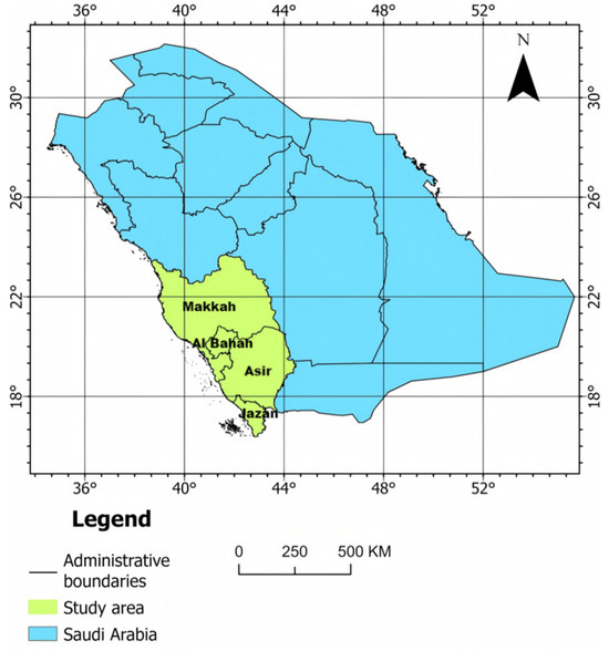 The study area is located in the southwest of Saudi Arabia, encompassing Al Bahah, Makkah, Jazan, and Asir, as show in Figure 1. The geographical extent of the study area is from 16°05′39.5″ N to 27°23′56.0″ N latitude and from 36°46′19.98″ E to 47°44′36.5″ E longitude. Saudi Arabia is an arid country in the usual sense of the word, with only a few exceptional semi-humid areas in the southwestern highlands with mountain streams, forests, and high-altitude terraces, which together constitute one of the most unusual ecological zones in the country [53]. According to the Ministry of Agriculture of Saudi Arabia, this region is endowed with vast natural forests with a woodland area of about 27,000 square kilometers, of which about 80% is dispersed in the Sarawat Mountains [54]. The region is rich in ecological resources, and more than 80% of the tree species in Saudi Arabia are found here, including Acacia and Ficus spp. It is characterized by a semi-arid climate due to high precipitation [55]. Precipitation in Saudi Arabia throughout the year is mainly concentrated from October of the current year to April of the following year, and in the other months there is almost no precipitation except in the southwestern region [56]. In the case of Asir, for example, although precipitation occurs essentially throughout the year, due to the influence of the Indian monsoon [57], precipitation also occurs mainly during the period from October of the current year to March of the following year with an average rainfall of 300 mm, which is about more than 60% of the annual precipitation of the region.