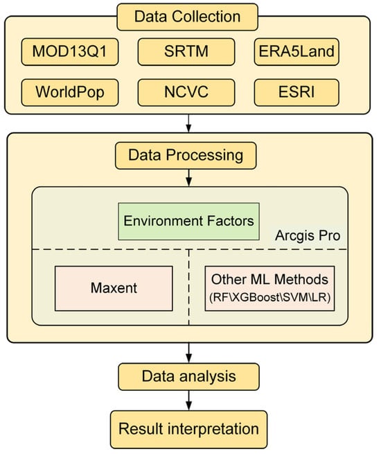 Maxent is a general-purpose approach for making predictions or inferences from incomplete information [63]. Its core principle is to estimate a probability distribution with maximum entropy under known constraints, producing the most uniform and least biased prediction [64]. In wildfire risk modeling, the model’s prediction space is defined by the study area, with recorded wildfire locations serving as presence samples. These samples are described by variables representing climatic, environmental, and anthropogenic conditions. Compared to other models, Maxent offers several advantages, including simple input requirements, ease of use, and stable performance. It can produce reliable spatial predictions using only presence data and associated environmental variables, without the need for absence data or randomly generated background points, making it particularly effective when datasets are limited or incomplete [65].