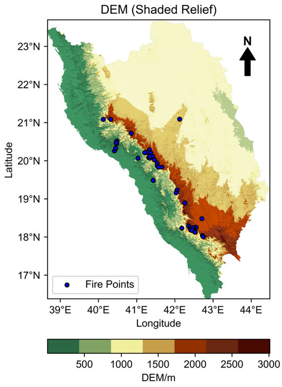 The wildfire location data were provided by King Khalid University and NCVC. The data were collected from 12 July 2019 to 18 October 2023, excluding wildfire locations with incomplete information. A total of 54 wildfire data points are shown in Figure 3, most of which tend to be regionally concentrated and are located near roads and in higher elevation areas.