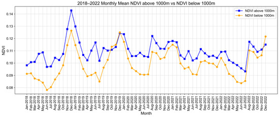 Monthly Mean NDVI Comparison (2018–2022) Between Elevations Above and Below 1000 m.