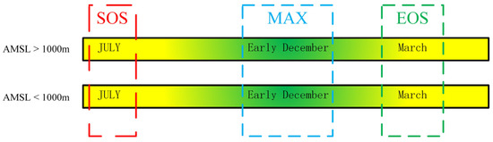Based on the observed dependence of vegetation phenology indicators on elevation and vegetation distribution, as illustrated in Figure 5 and Figure 6, a site-specific phenological scenario was established for the study area, as shown in Figure 7.