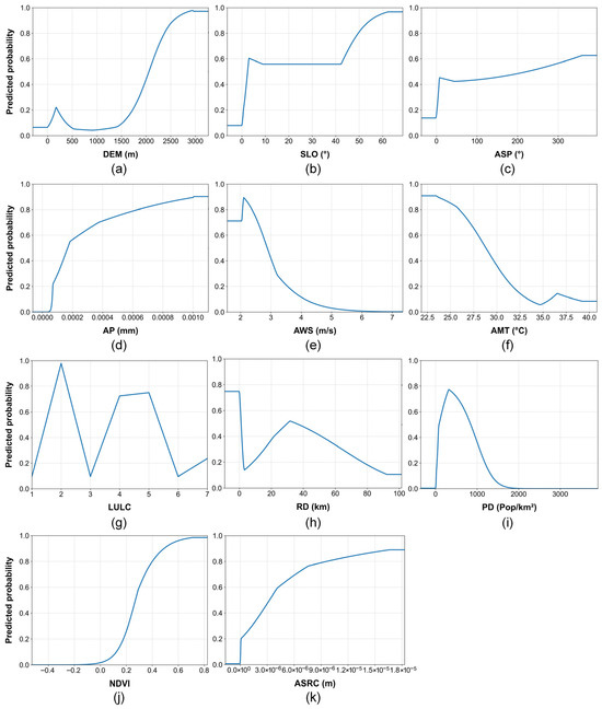 Response curves for wildfire environmental variables in the study area: (a) DEM, (b) SLO, (c) ASP, (d) AP, (e) AWS, (f) AMT, (g) LULC, (h) RD, (i) PD, (j) NDVI, and (k) ASRC.