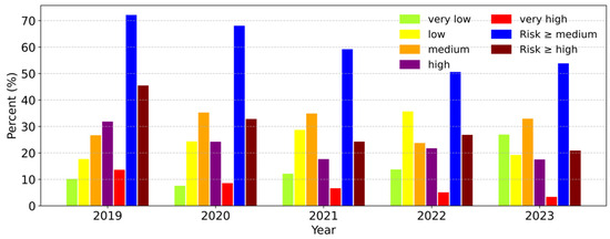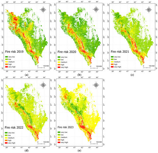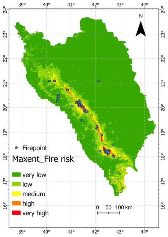 The ASCII file generated by the Maxent model for wildfire risk prediction was imported into ArcGIS Pro 3.3. Using the natural breaks classification method, wildfire risk in southwestern Saudi Arabia was categorized into five levels: very low, low, medium, high, and very high, as shown in Figure 9. The proportion of the study area in each category is 82.36%, 12.84%, 3.07%, 1.06%, and 0.67%, respectively. High and very high risk areas together account for only 1.73% of the total area, indicating that the vast majority of the region (98.27%) falls into the medium to low risk categories. Spatially, areas classified as high or very high risk are mainly located in mountainous regions with higher elevations, steeper slopes, and greater vegetation cover, while low and medium-risk areas are found in lower elevation zones with more sparse vegetation.
