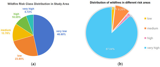 The trained random forest model generated a wildfire risk map (Figure 10), which was classified into five categories (very low to very high) using the natural breaks method. These categories accounted for 46.60%, 23.85%, 13.78%, 10.05%, and 5.72% of the total study area, respectively (Figure 11a). Notably, no wildfire sites were identified in the very low risk zone, while the distribution of wildfire occurrences across the remaining four categories was 1.85% in low, 9.26% in medium, 1.85% in high, and 87.04% in very high risk areas, as shown in Figure 11b. This spatial pattern demonstrates the model’s effectiveness in identifying high risk zones, with the majority of wildfires concentrated in the most vulnerable regions.