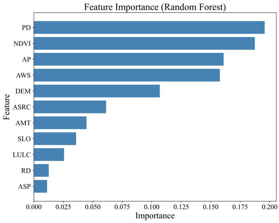 Four other ML models were employed to analyze fire occurrence data and associated environmental factors, with 70% of the dataset allocated for training. Their performance was also evaluated using the AUC metric. The detailed results are summarized in Table 3. Although all models achieved an AUC value exceeding 0.8, Maxent achieved the highest AUC value, and Random Forest the second highest. We used Random Forest to assess wildfire risks in the study area and compared the results with those obtained from the Maxent model.
