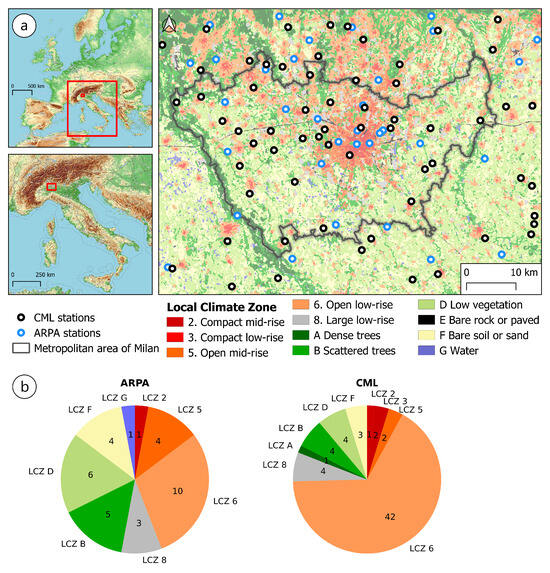 Study area in Milan, Italy. (a) Distribution of authoritative ARPA and crowdsourced CML meteorological stations overlaid on the LCZ map for June 2022; basemap: OpenTopoMap (opentopomap.org/, accessed on 22 July 2025); (b) pie chart showing the number of ARPA and CML stations assigned to each LCZ class based on the dominant class within a 75 m circular buffer.
