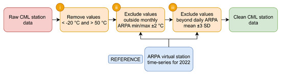 Although crowdsourced data offer valuable microclimatic detail, they require rigorous quality control due to potential sensor misplacement (e.g., proximity to walls) [21,24,68]. For this reason, CML data were cleaned using ARPA as a reference, given its reliable, quality-controlled ground measurements. A virtual ARPA station was created by aggregating observations of all stations at each time step into a mean and standard deviation (SD). Although ARPA is highly reliable, z-score outlier removal was applied to remove minor inconsistencies (<0.01% observations removed). The CML cleaning procedure is partially based on [69] and includes three steps, outlined in Figure 2. After removing climatologically unlikely values in step (i), ARPA is used in the following two cleaning steps, step (ii) and (iii), aiming to filter out local outliers from the CML time series. During the cleaning process, all CML data were resampled to 10 min intervals to align with ARPA.