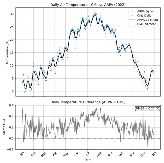 As shown in Figure 4, CML’s annual daily temperature cycle shows a close match to ARPA, with temperatures strongly correlated ( = 0.99). For most of the year, ARPA tends to be slightly warmer than CML, typically within 0.2 °C. During summer, such a difference is slightly enhanced, reaching up to 0.6 °C. Given that CML sensors have a stated accuracy of ±0.3 °C, these differences are within a reasonable margin [67]. An annual root mean squared error (RMSE) of 0.27 °C further confirms the reliability of CML data and supports its use in this study.
