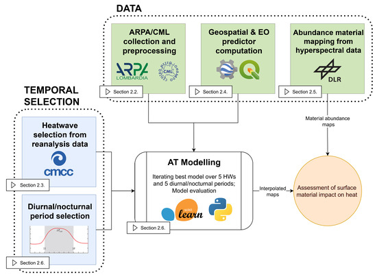 - To evaluate the potential of hyperspectral (HS) satellite imagery for understanding the influence of surface material abundances on AT; this aspect represents a novelty in the literature.