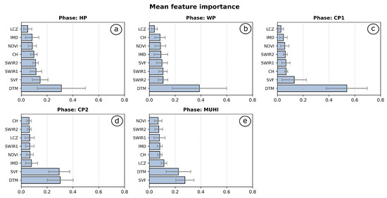 Feature importance scores for all predictor variables, per phase (a–e). The importance values reflect how much each feature contributed to predicting AT, averaged across all trees in the forest. These are relative, unitless scores, normalised so that their sum equals one. The importances are averaged for each phase over all HWs, with SD indicated by ticks at the top of each bar.