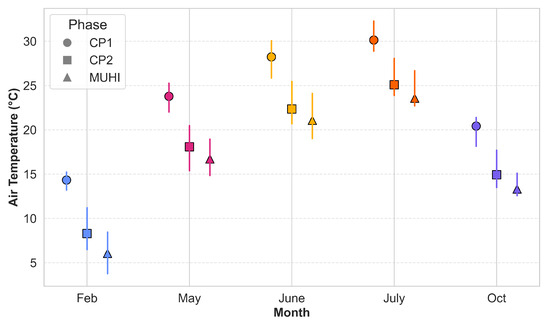 AT distribution by phase (CP1, CP2, MUHI) across months. Each vertical line represents the full range (min–max) of temperatures, while markers denote the mean: circle for CP1, square for CP2, and triangle for MUHI. Colours correspond to months.
