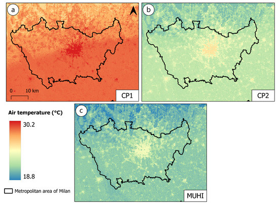 An example of predicted AT distribution over diurnal phases is shown in Figure 11, referring to the June HW event. While here only three maps are displayed, the reader is referred to Figure A1 for the full set of predicted AT maps. For all three phases, the central urban area is significantly warmer than its surroundings. The temperature difference between dense urban zones and forested areas is between 3 and 5 °C during the CP2 and MUHI phases (Figure 11b,c). During the CP1 (Figure 11a), this difference is somewhat smaller, and the effect of elevation is more visible, with the southern plain showing higher temperatures than the elevated northern zone. In CP2 and MUHI, smaller urban settlements also show higher temperatures compared to their agricultural surroundings. The coolest areas are the hills to the north and the well-vegetated Ticino River valley (in the south-west). Additionally, several central urban parks (such as Parco Sempione or Parco Indro Montanelli) experience lower AT values compared to their surrounding built-up zones. Using LCZ classes, these parks were delineated as LCZ A (dense trees), while LCZ 2, 3, 5, 8, and E were merged into a single class representing the dominant urban fabric in central Milan. Statistics computed for CP1, CP2, and MUHI show that the cooling effect of urban vegetation reaches around 1–2 °C compared to the combined urban class. Finally, it is interesting to note that during CP2 and MUHI, AT does not fall below 20 °C across most of the urbanised area. These conditions correspond to tropical nights, which have known implications for human health.