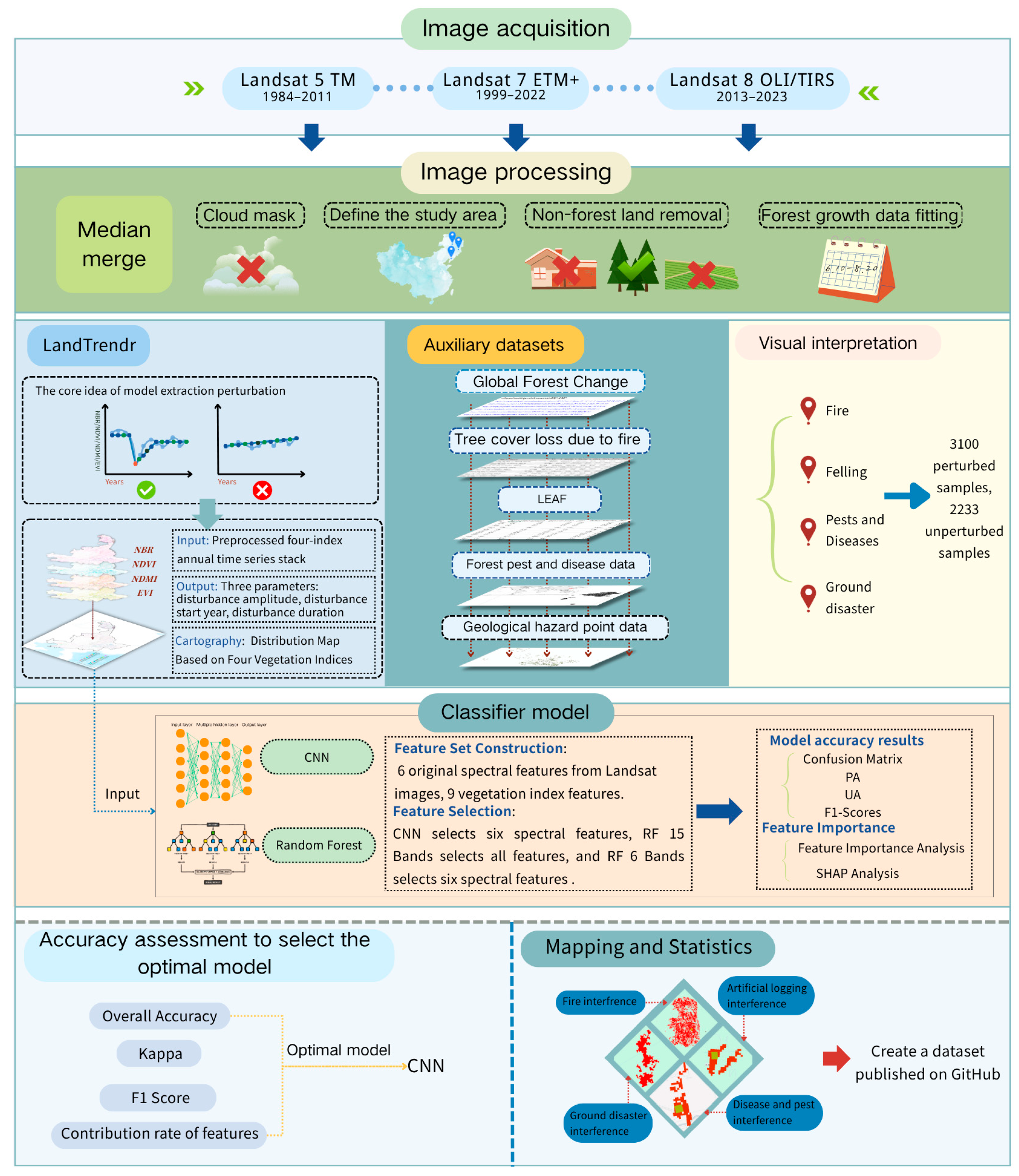 Zheng, Z.; Yu, Y.; Yang, X.; Yuan, X.; Hou, Z. A Novel Framework for Long-Term Forest Disturbance Monitoring: Synergizing the LandTrendr Algorithm with CNN in Northeast China. Remote Sens. 2025, 17, 3521. https://doi.org/10.3390/rs17213521