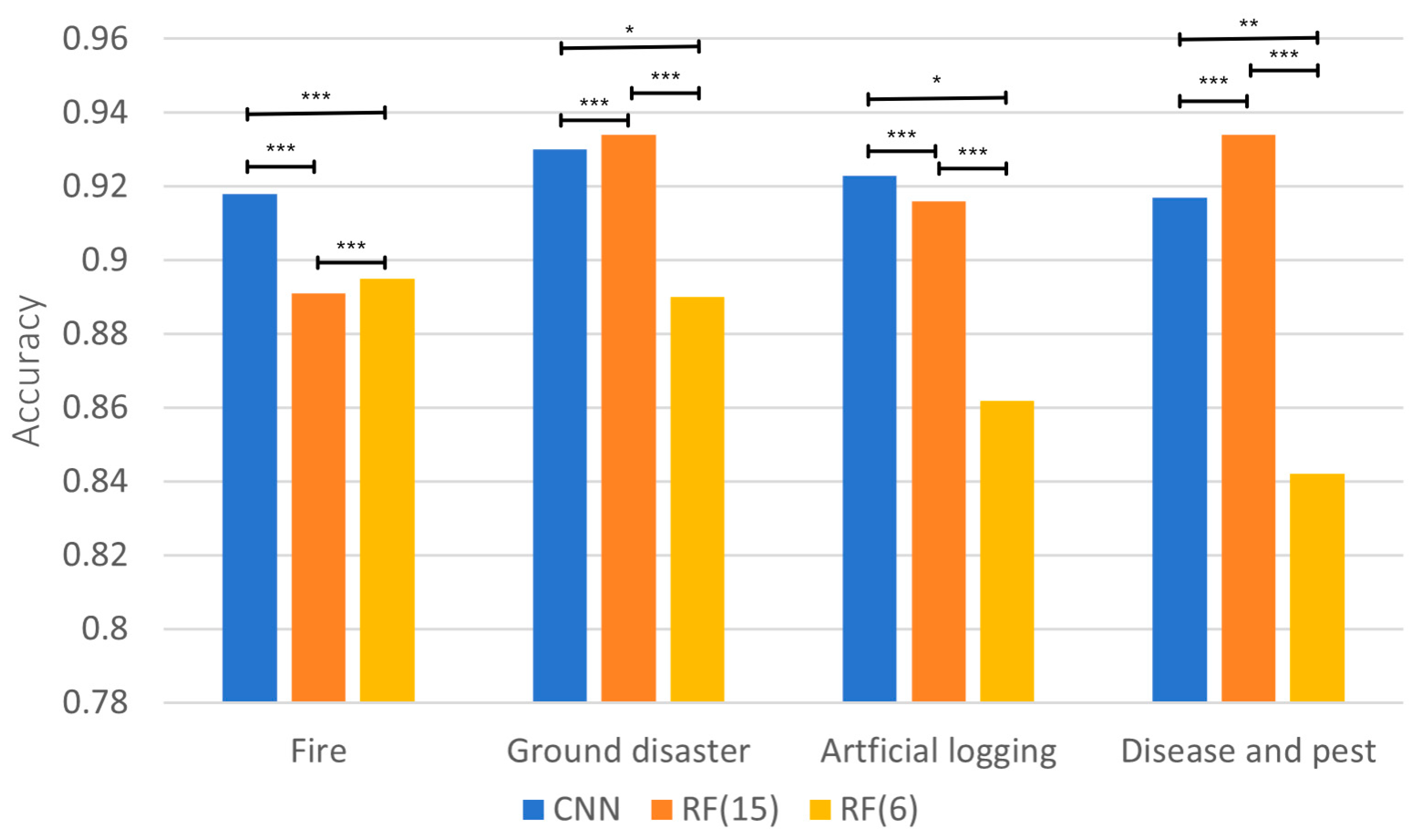 | McNemar’s Statistic | Fires | Ground Disasters | Artificial Logging | Diseases and Pests | Overall |