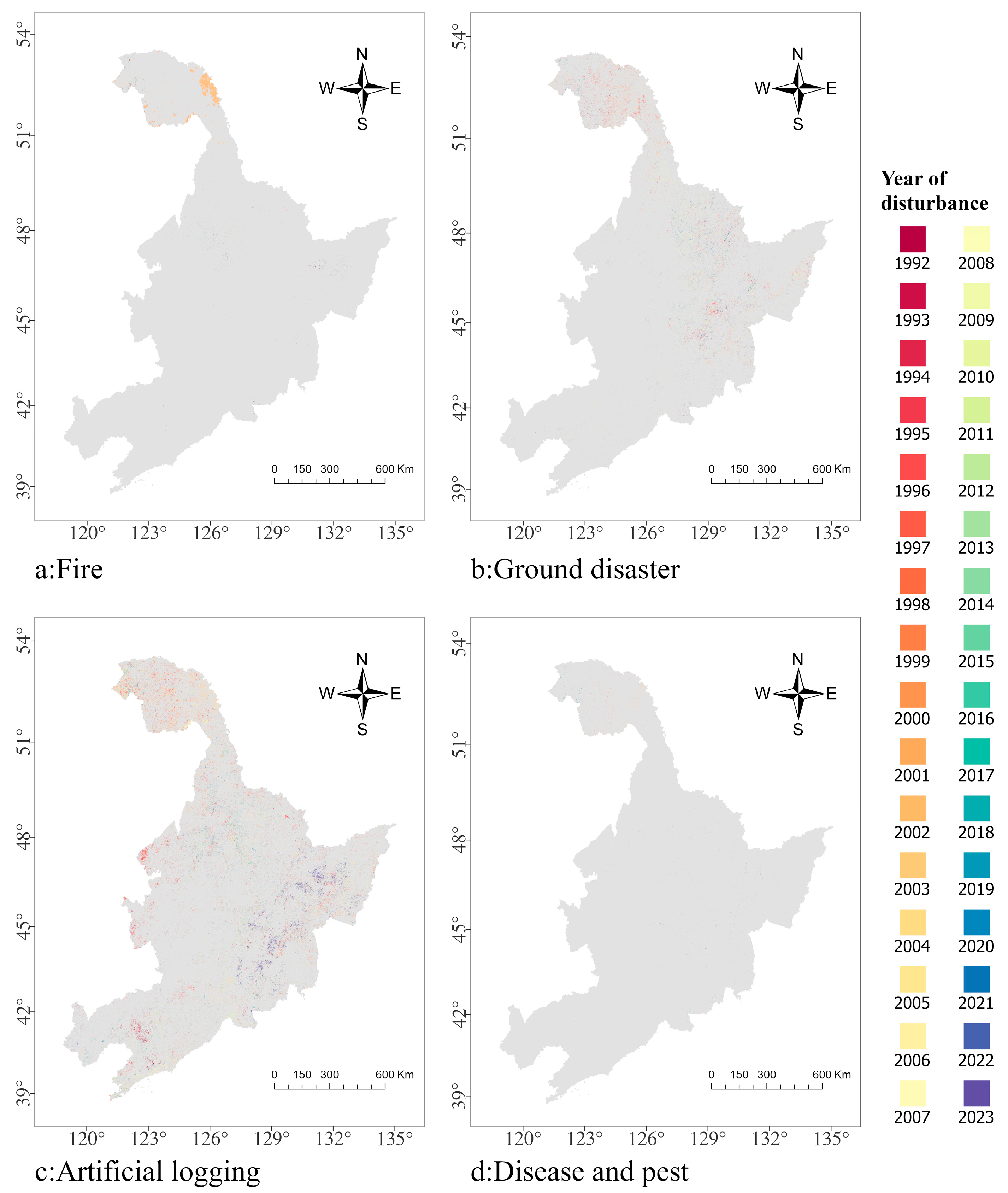 | Disturbance Type | Sample size | Percentage (%) | Time Span | Spatial Distribution |