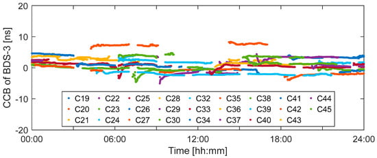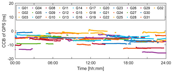 In the model described by Equation (14), correlation still exists between CCB and receiver clock bias. Typically, one satellite can be selected as a reference and constrained to zero: