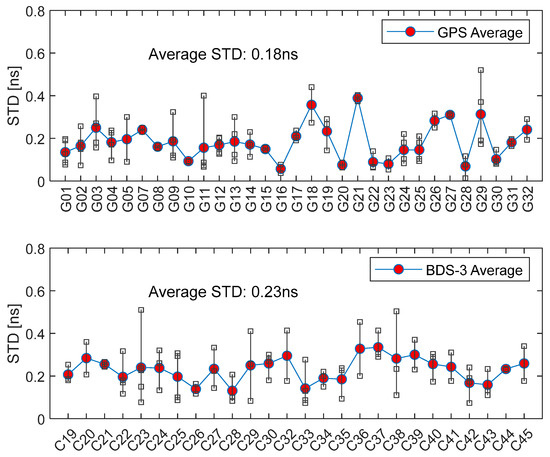By calculating the standard deviation (STD) of CCB across different arcs for each satellite, the temporal stability of CCB was analyzed, and the results are shown in Figure 4. It can be observed that the STD of CCB across different arcs generally does not exceed 0.5 ns. The maximum values are 0.52 ns for GPS G29 and 0.51 ns for BDS-3 C23. The average STDs of CCB for GPS and BDS-3 satellites are 0.18 ns and 0.23 ns, respectively, indicating that the stability of GPS CCB is slightly better than that of BDS-3. Overall, the CCB of both GPS and BDS-3 satellites exhibits high temporal stability.
